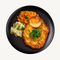 *kotlet schabowy (ok. 70g) + ziemniak gotowany (ok. 70g) + marchewka z groszkiem z puszczki konserwowa (2 łyzki) + masło (1.5 łyżeczki)